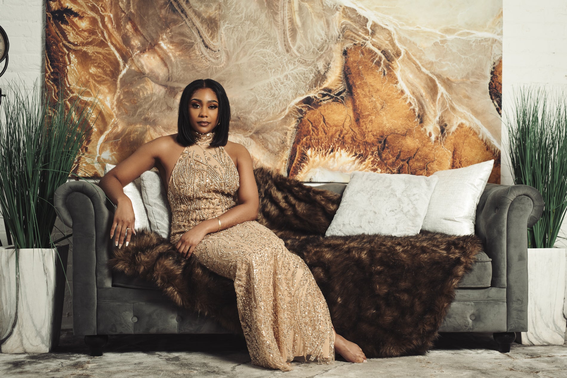 This is a custom Chuck B. Moore piece. Gold sequin, floor length evening gown. Sleeveless with mock neck.