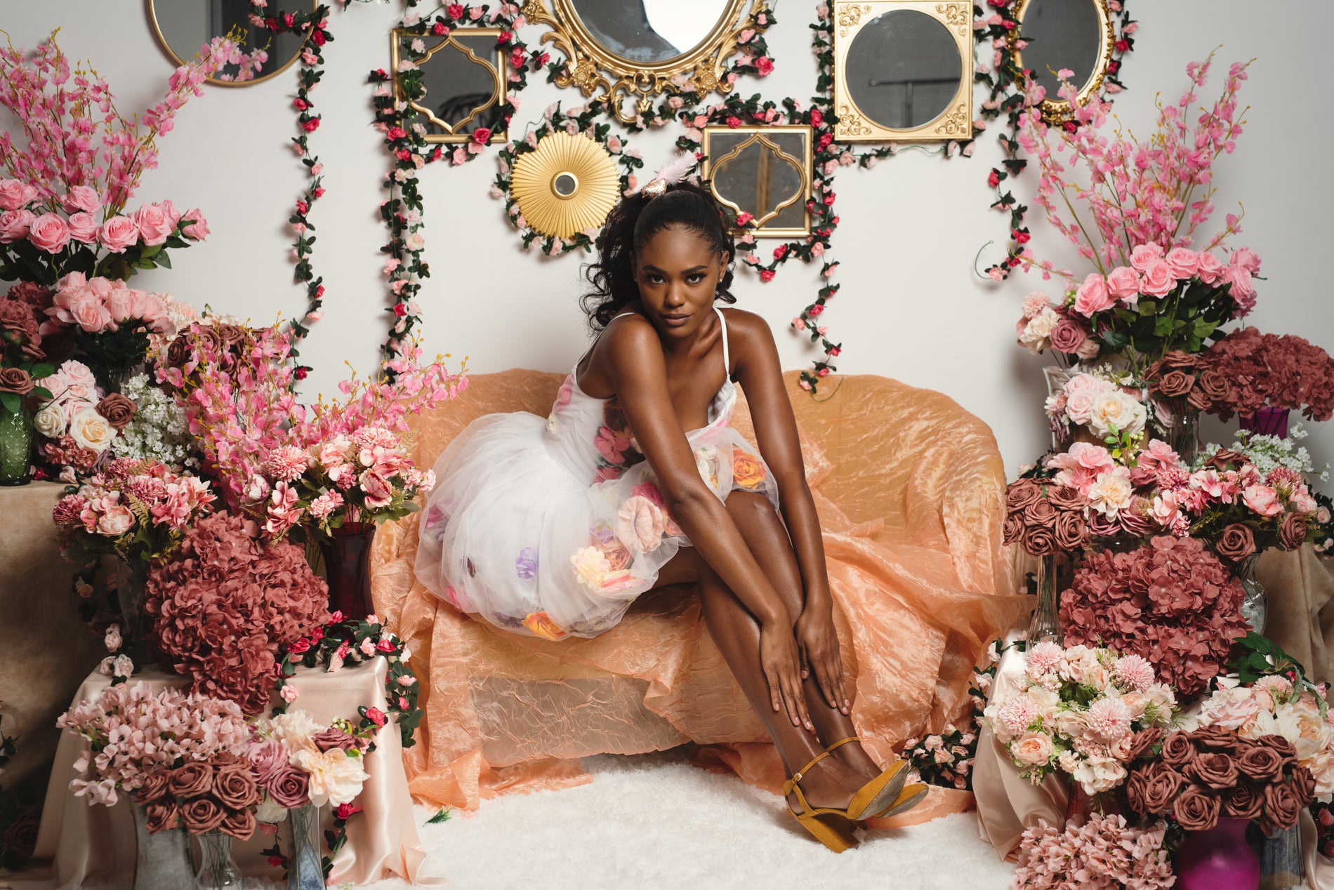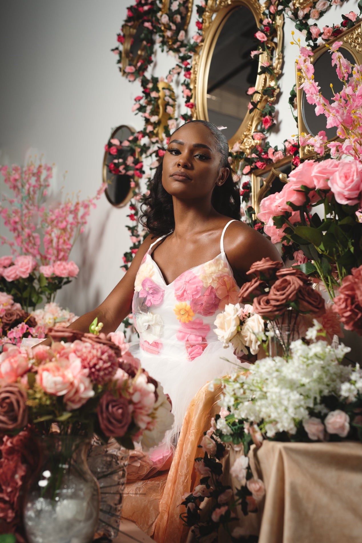 This is a custom Chuck B. Moore piece. White, spaghetti strap baby doll dress with floral accents. Perfect for a spring/summer soirée!